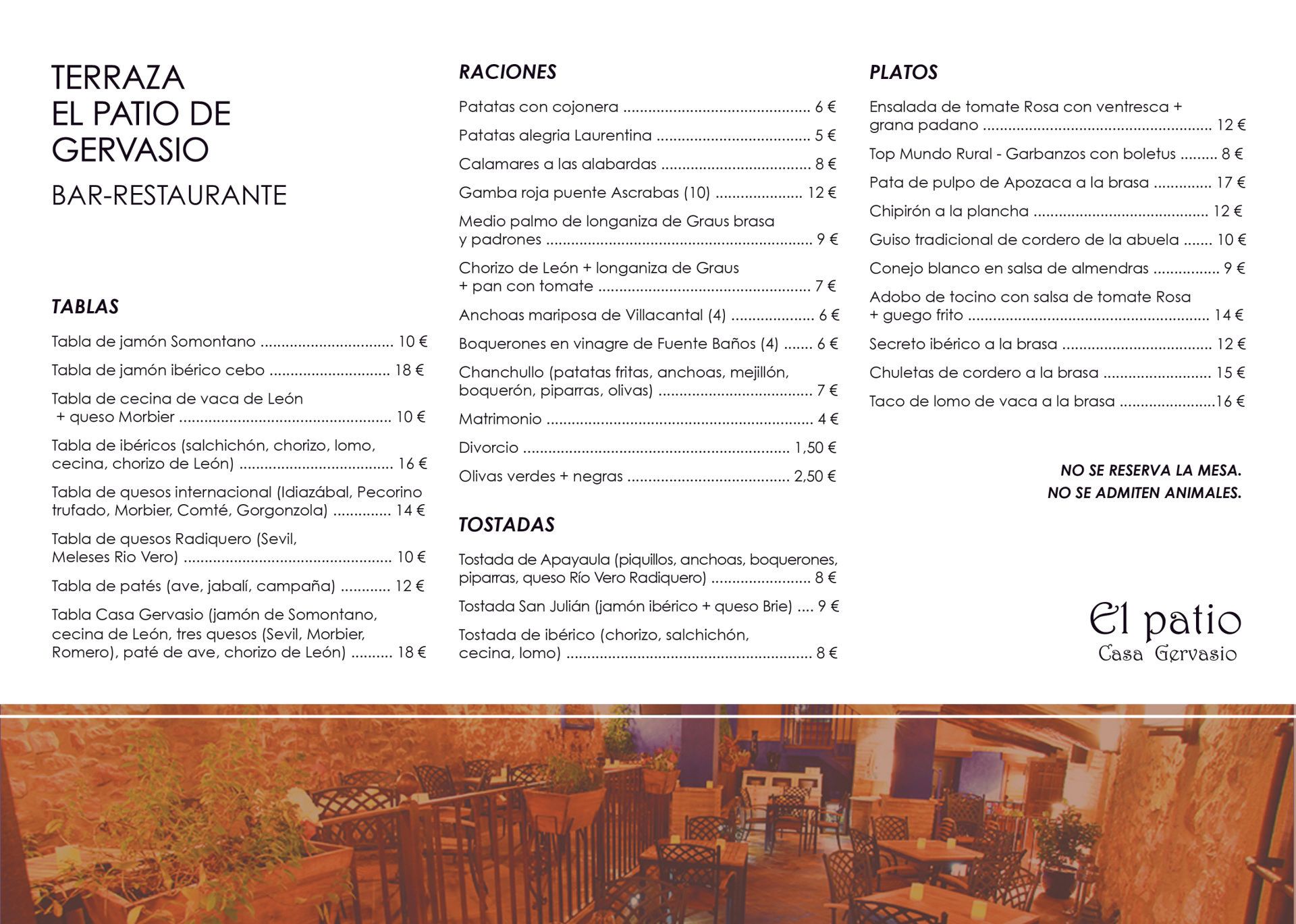 SIf what you want is to have some tapas accompanied by a good wine, we offer you "El Patio de Gervasio". A cozy terrace rustic decorated in the style of the houses in the beautiful town of Alquézar.