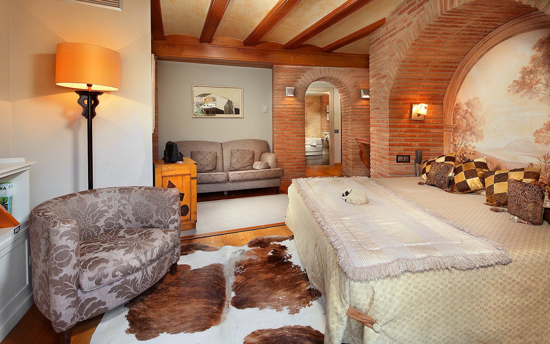 Le lit est placé sous une arcade en brique semi-circulaire avec un trompe l'oeil du paysage d'automne du somontano et de ses oiseaux. L'ouverture de votre balcon illumine ses tons marron, crème et rougeâtre. Le placard se démarque, une ancienne armoire de récupération. La baignoire d'hydromassage est rectangulaire, avec la salle de bain en marbre trabertine et calatorado.